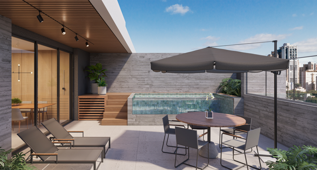 Coberturas Duplex de 303 m², 4 suítes privativas. Já o sol, apresenta-se de maneira única nos apartamentos e é homenageado na torre Sonne.